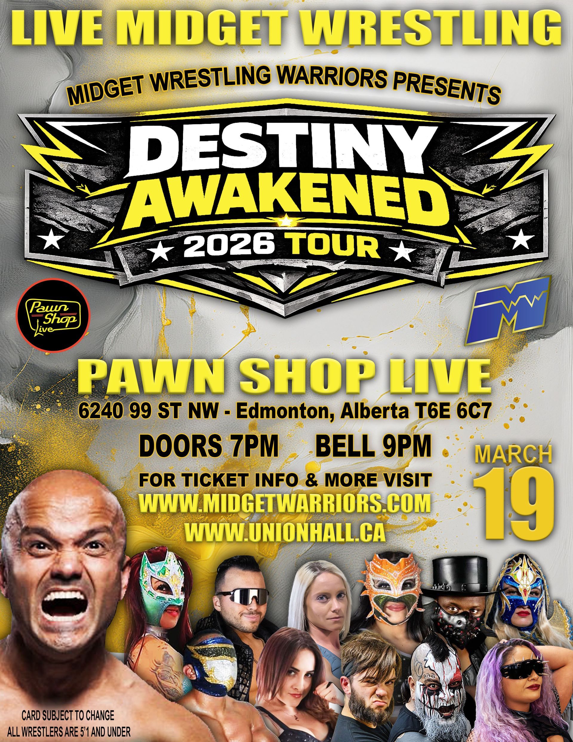 Get ready as the Destiny Awakened Tour rolls into town for a massive show, showcasing the biggest names in professional midget wrestling — and they’re bringing larger-than-life personalities, athleticism, and entertainment that can only be found inside a Midget Wrestling Warriors ring!