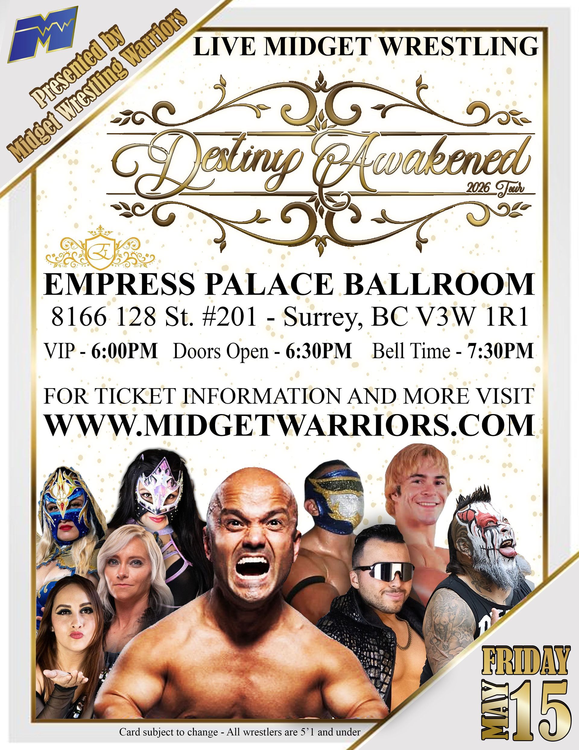 Get ready as the Destiny Awakened Tour rolls into town, showcasing the biggest names in professional midget wrestling — and they’re bringing larger-than-life personalities, athleticism, and entertainment that can only be found inside a Midget Wrestling Warriors ring!