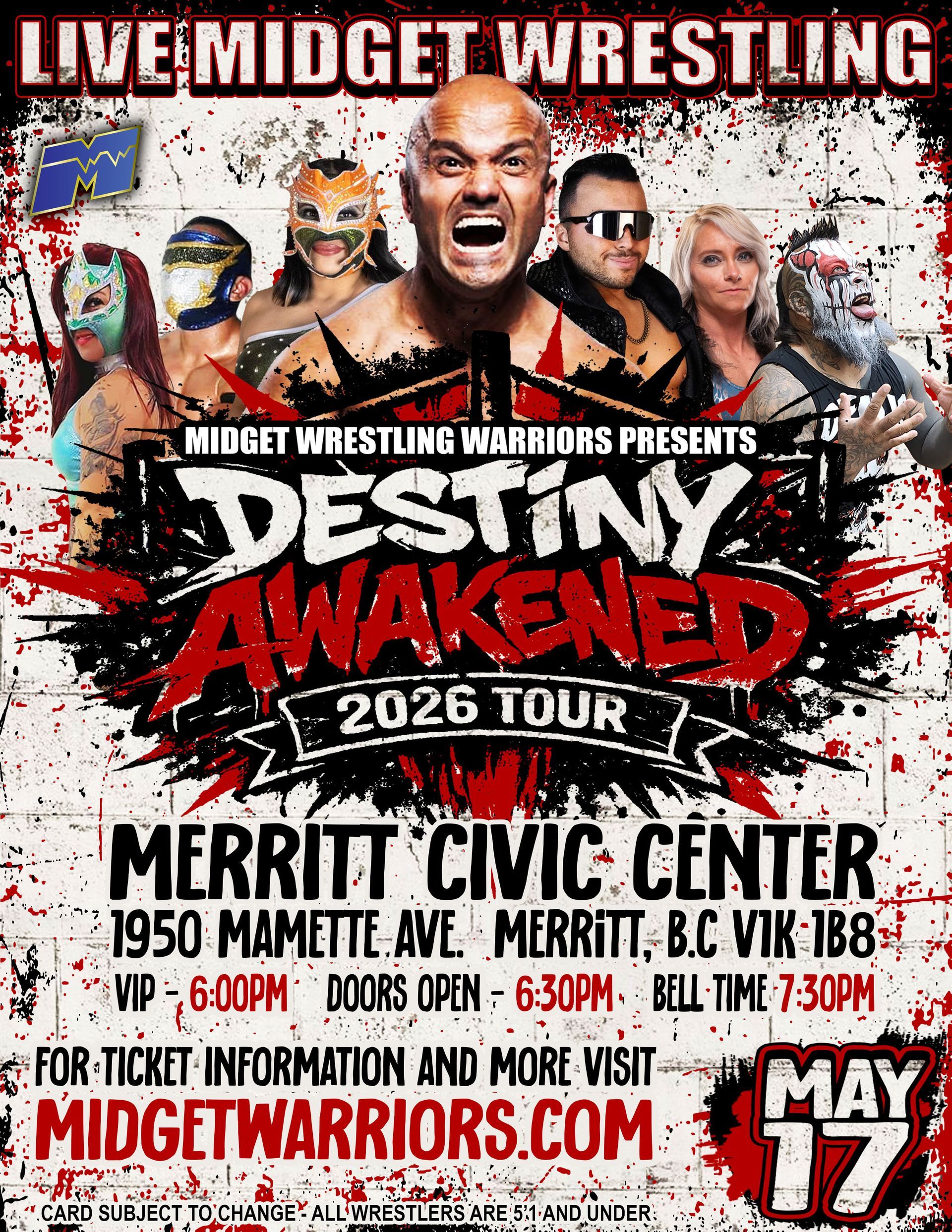 Get ready as the Destiny Awakened Tour rolls into town, showcasing the biggest names in professional midget wrestling — and they’re bringing larger-than-life personalities, athleticism, and entertainment that can only be found inside a Midget Wrestling Warriors ring!