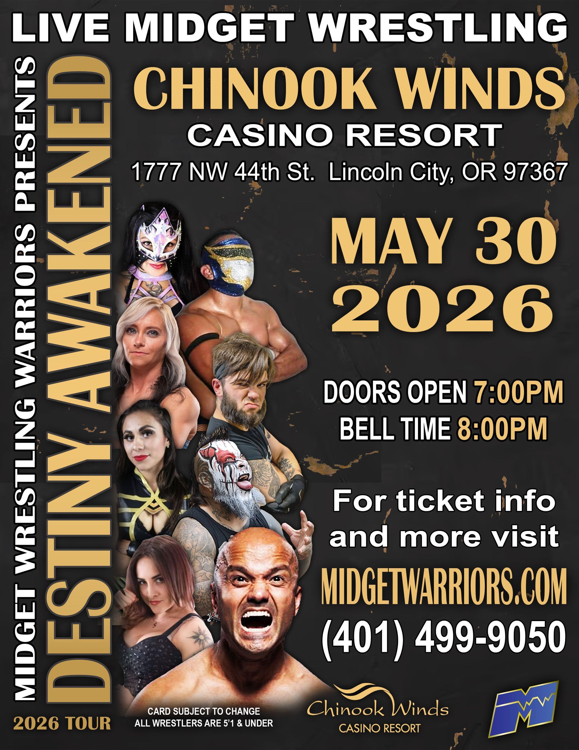 Get ready as the Destiny Awakened Tour rolls into town, showcasing the biggest names in professional midget wrestling — and they’re bringing larger-than-life personalities, athleticism, and entertainment that can only be found inside a Midget Wrestling Warriors ring!